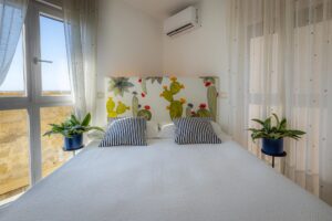 Al primo piano vi è una confortevole camera matrimoniale che gode di una splendida vista mare ed è dotata di un bagno completo.