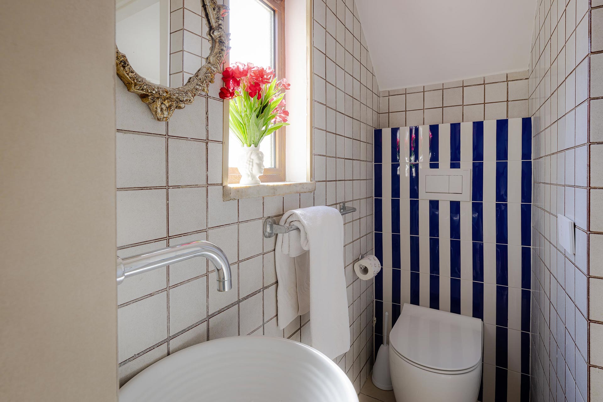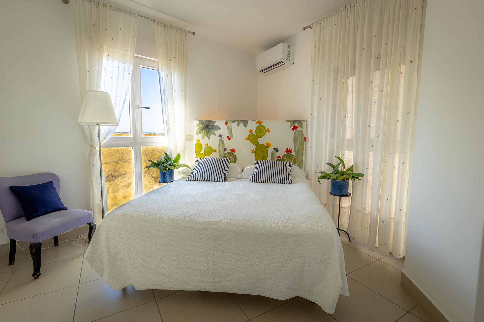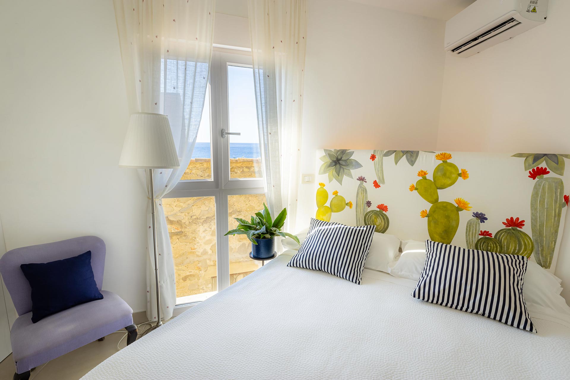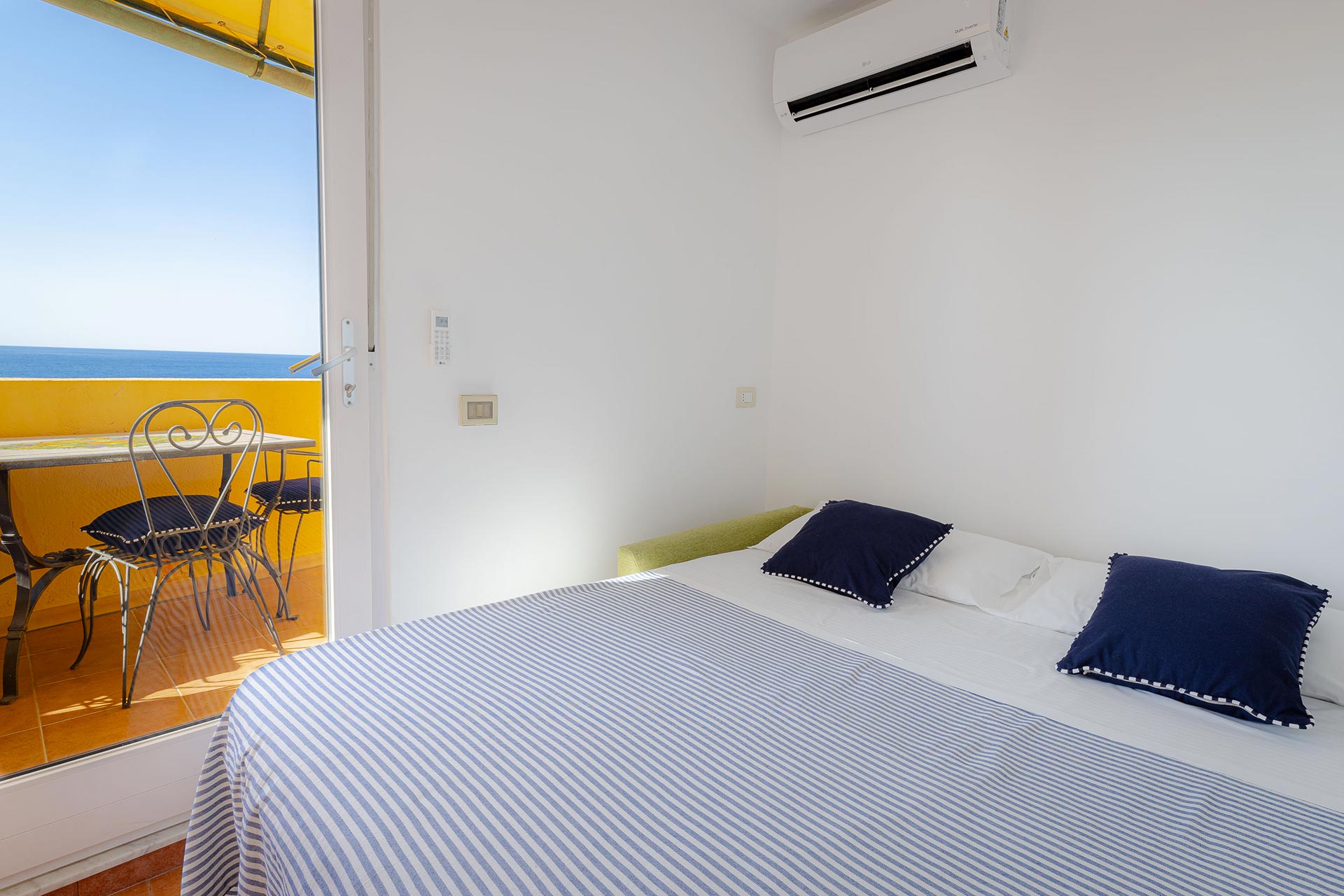 Al primo piano vi è una confortevole camera matrimoniale che gode di una splendida vista mare ed è dotata di un bagno completo.